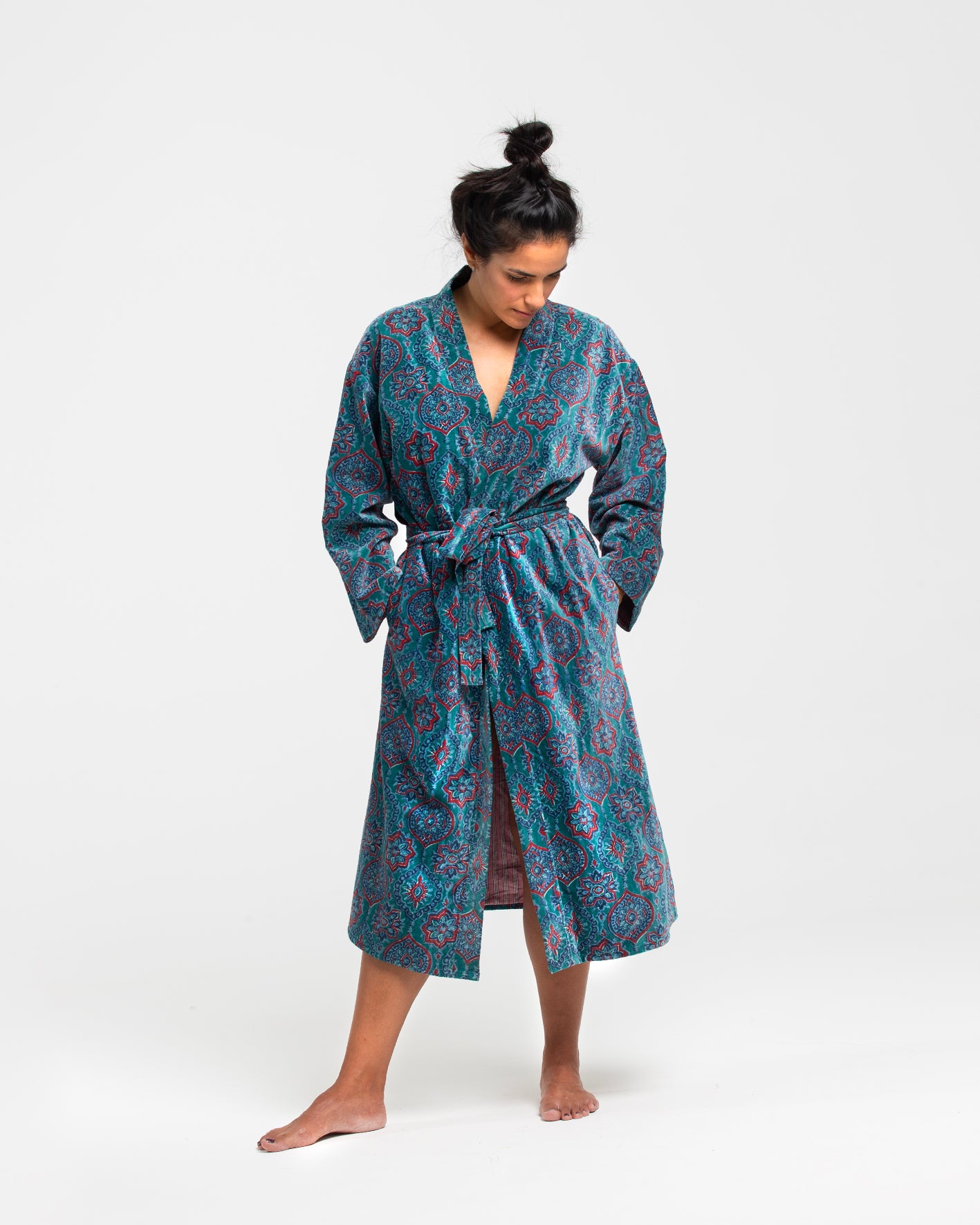 A printed velvet kimono is the epitome of luxury and style. Crafted from sumptuous velvet fabric, it features exquisite, intricate patterns and designs, adding a touch of opulence to any wardrobe. The rich texture and vibrant colors make it a statement piece for lounging in elegance or making a fashionable entrance at special occasions.