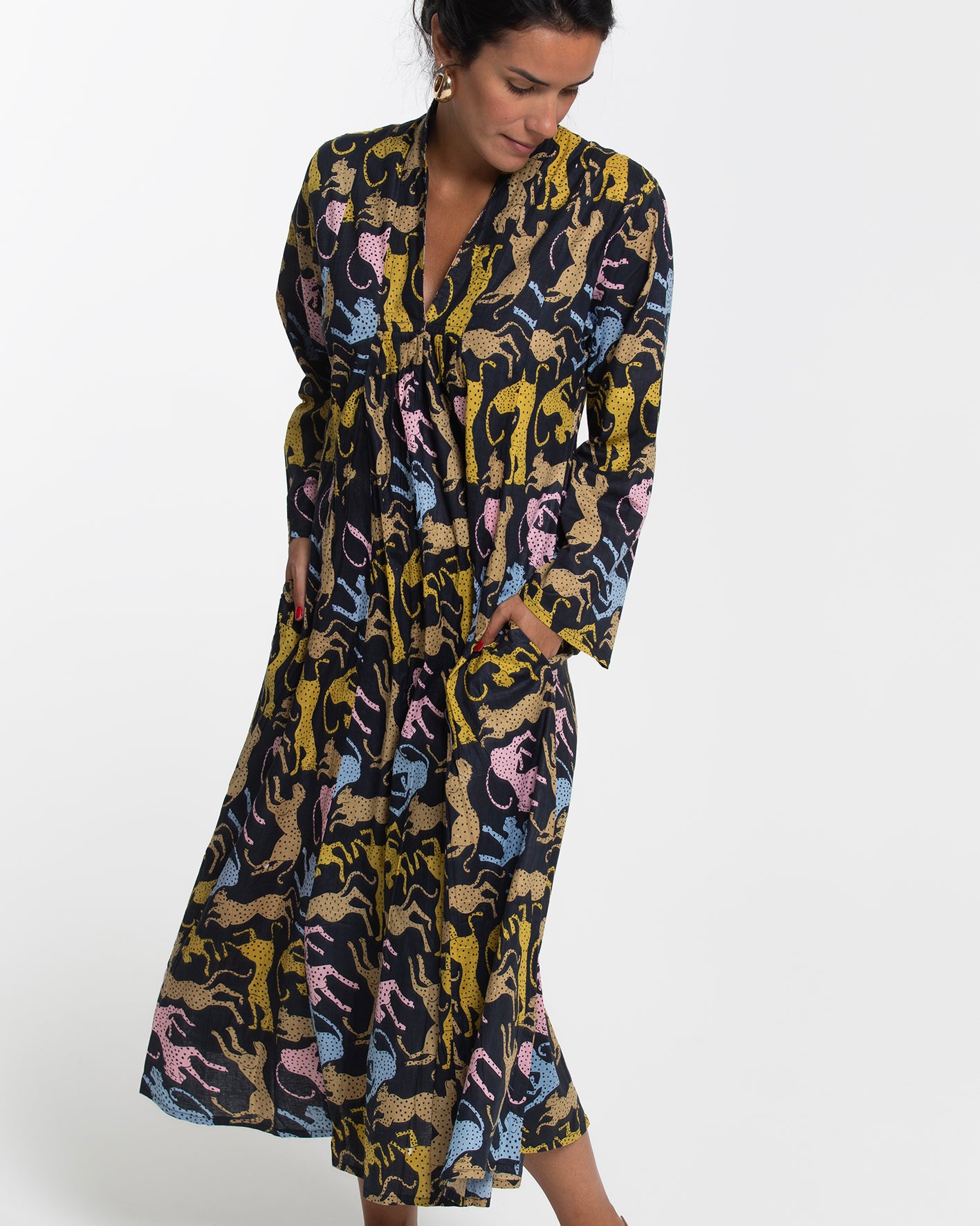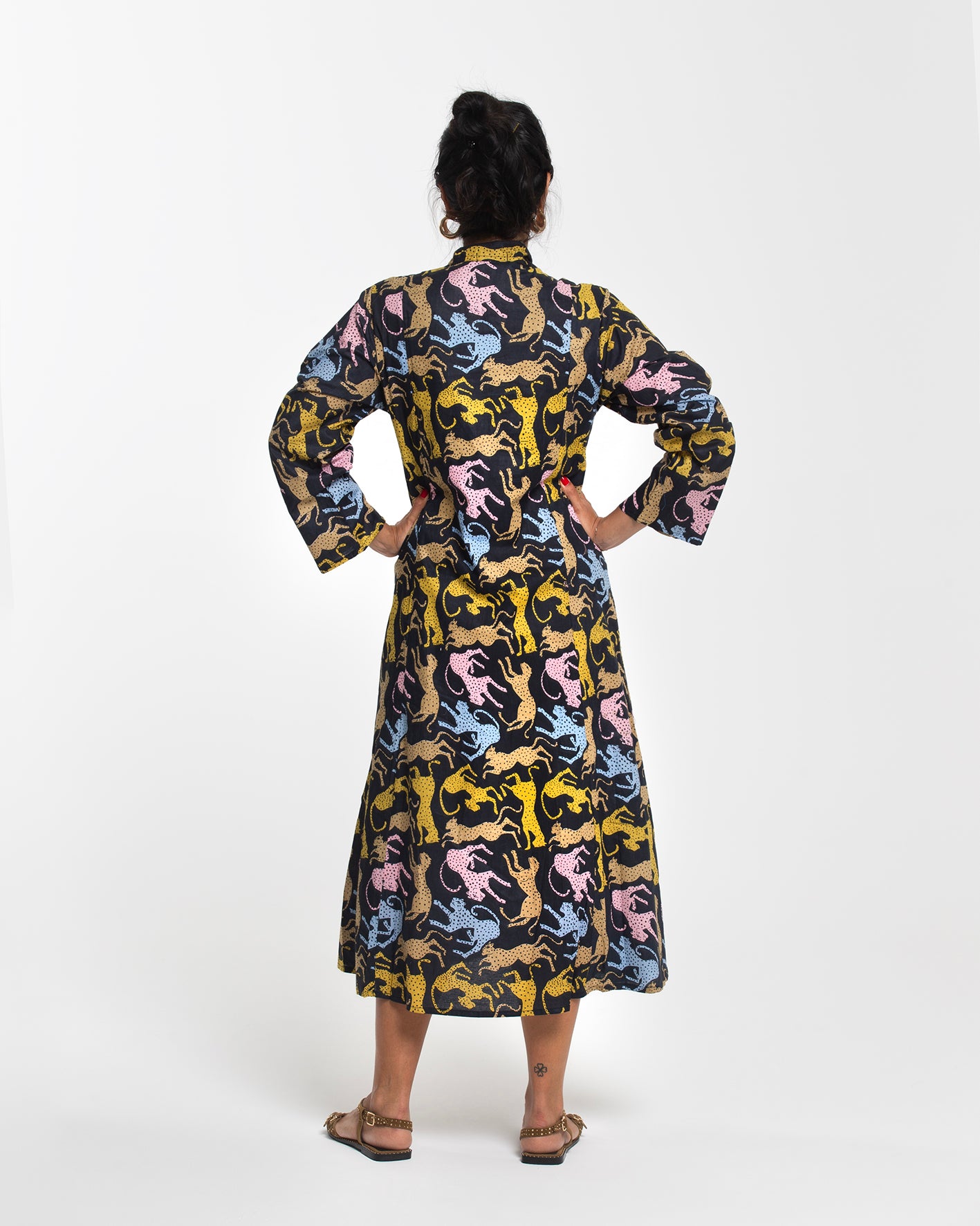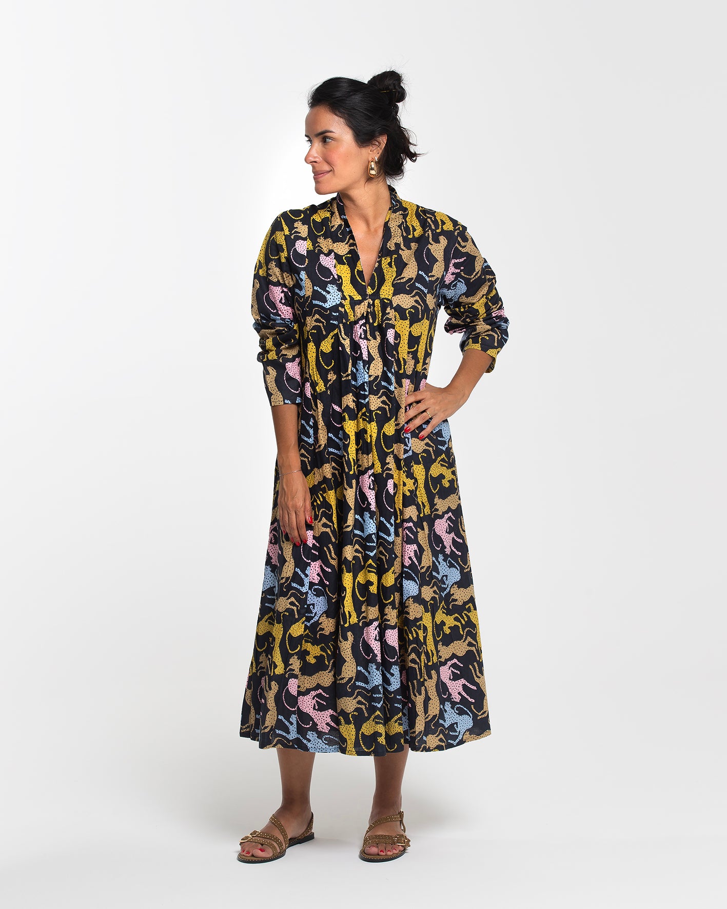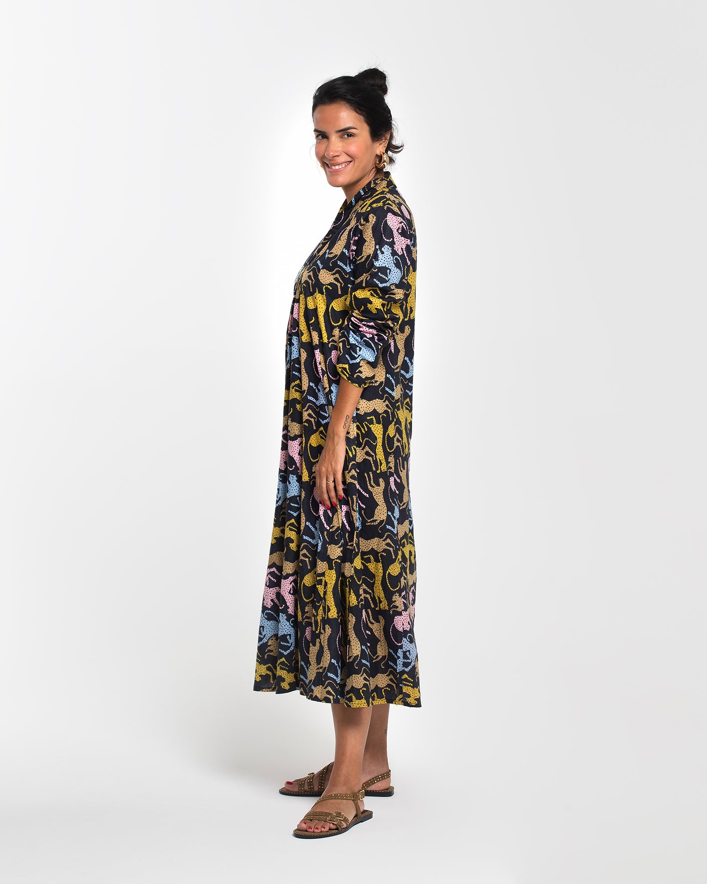 DARK BLUE MIDI DRESS COLORFUL LEOPARDS