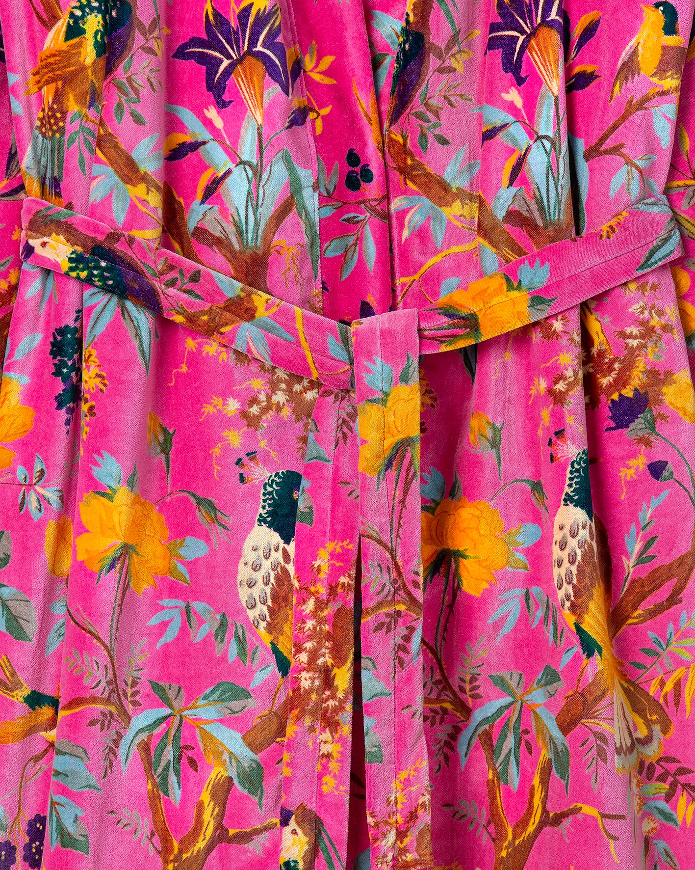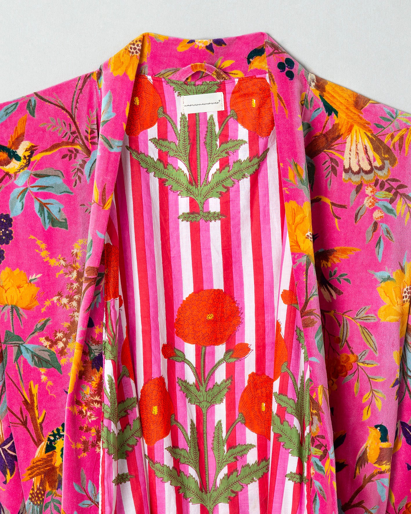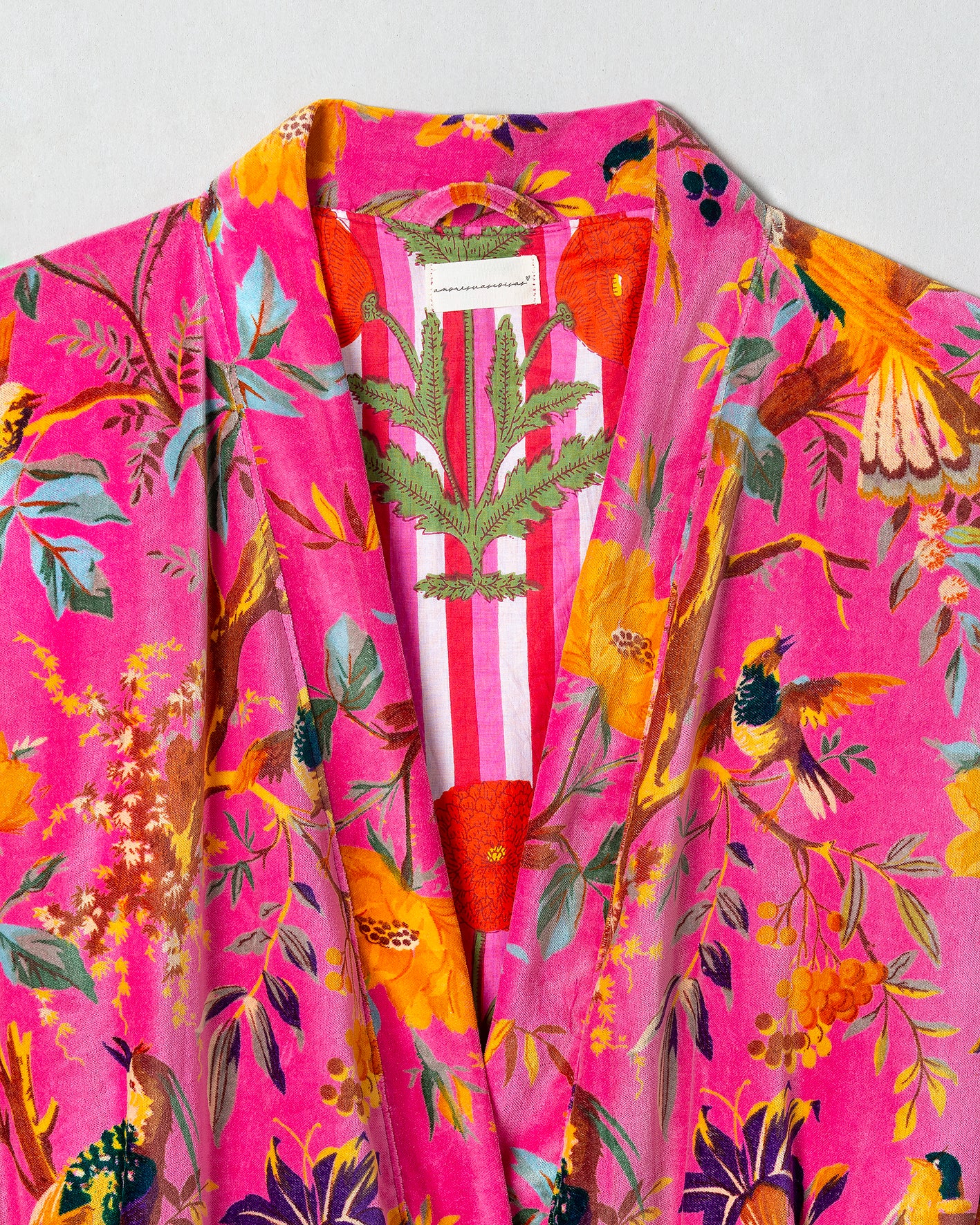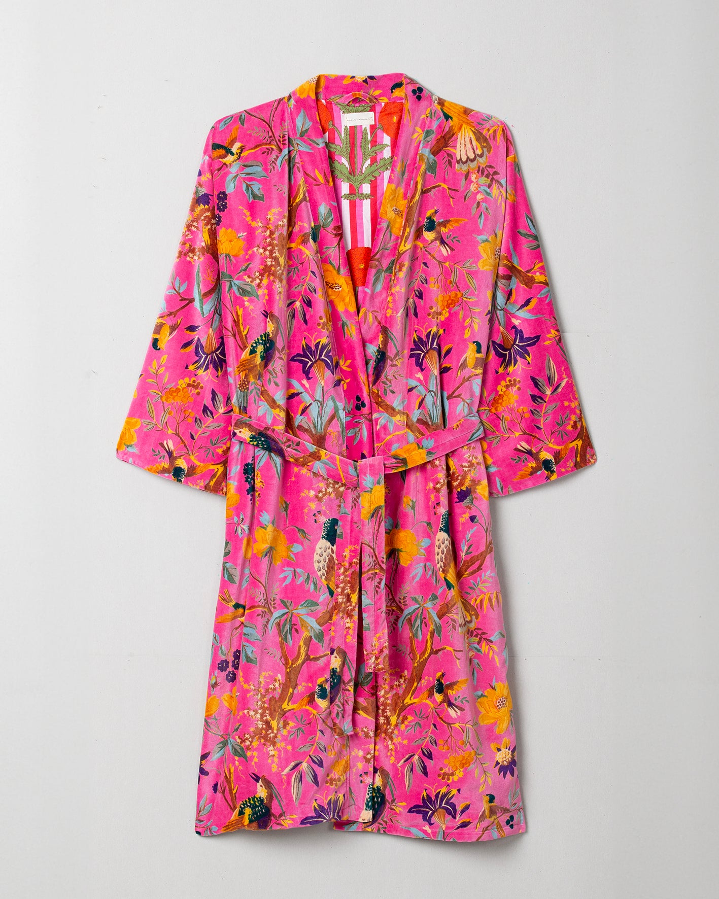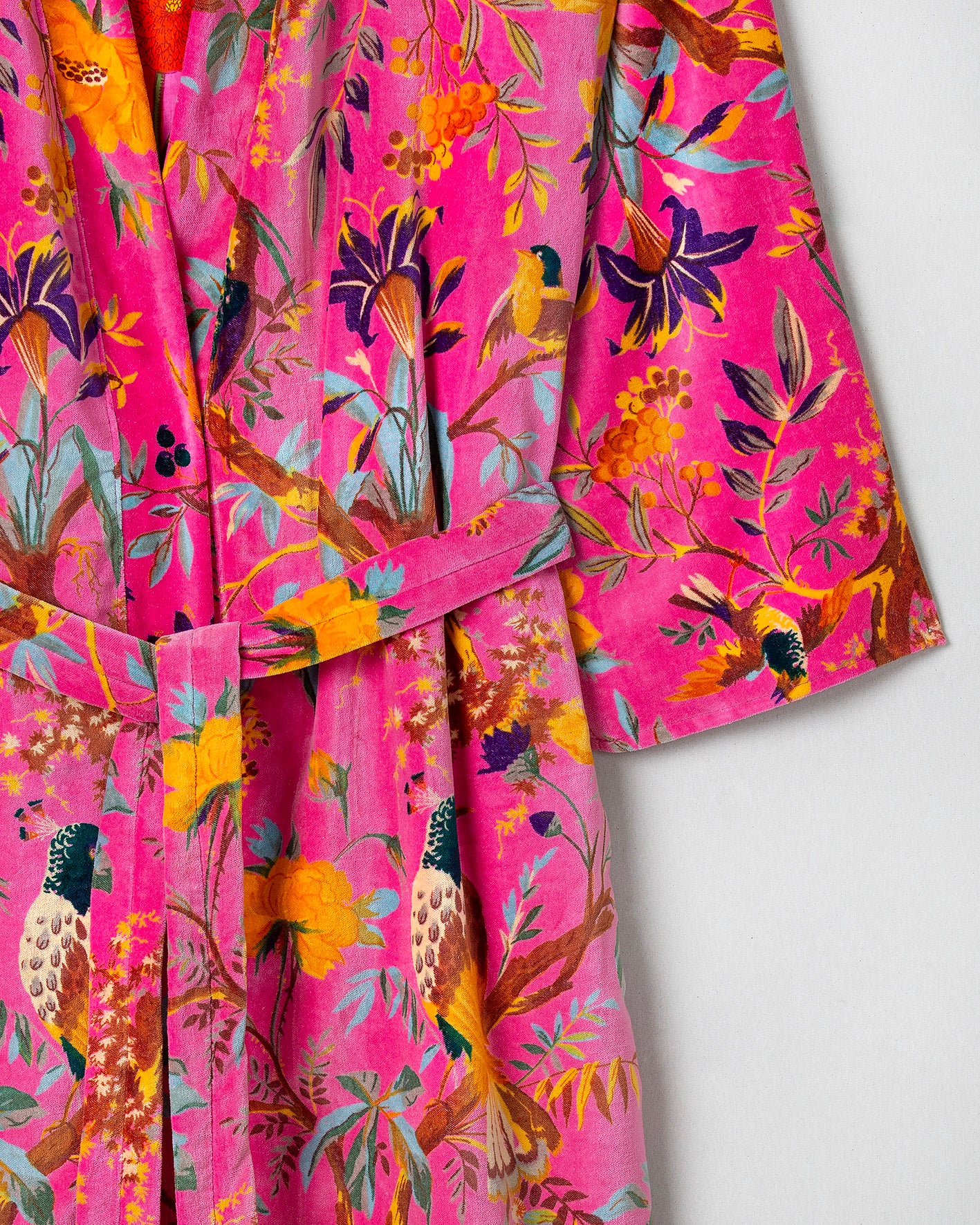 A printed velvet kimono is the epitome of luxury and style. Crafted from sumptuous velvet fabric, it features exquisite, intricate patterns and designs, adding a touch of opulence to any wardrobe. The rich texture and vibrant colors make it a statement piece for lounging in elegance or making a fashionable entrance at special occasions.