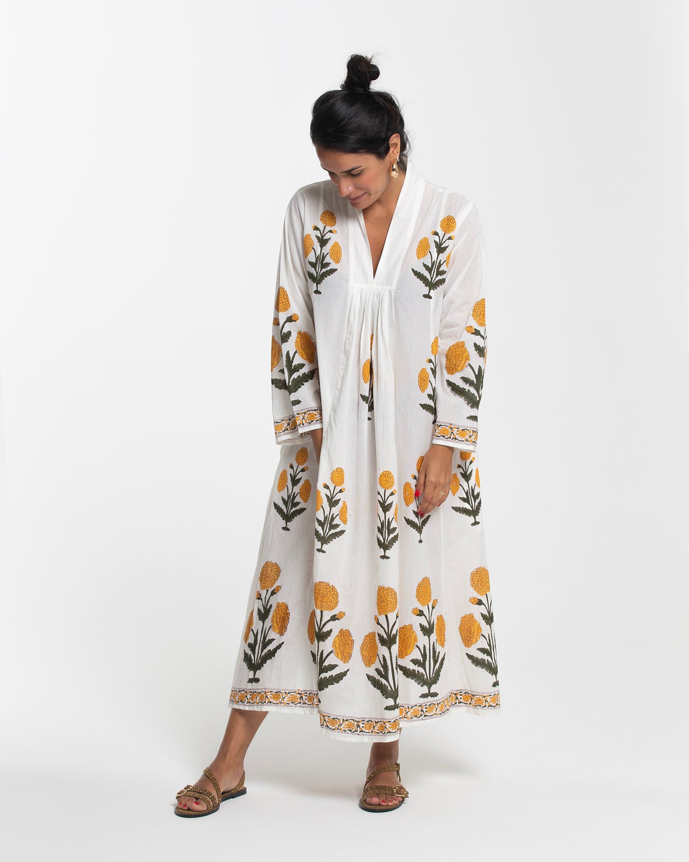 Make a statement with our White Sunflower Midi Dress. With its V neckline and side seam pockets, this dress is both stylish and practical. Additionally, the sustainable material makes it an environmentally friendly choice.