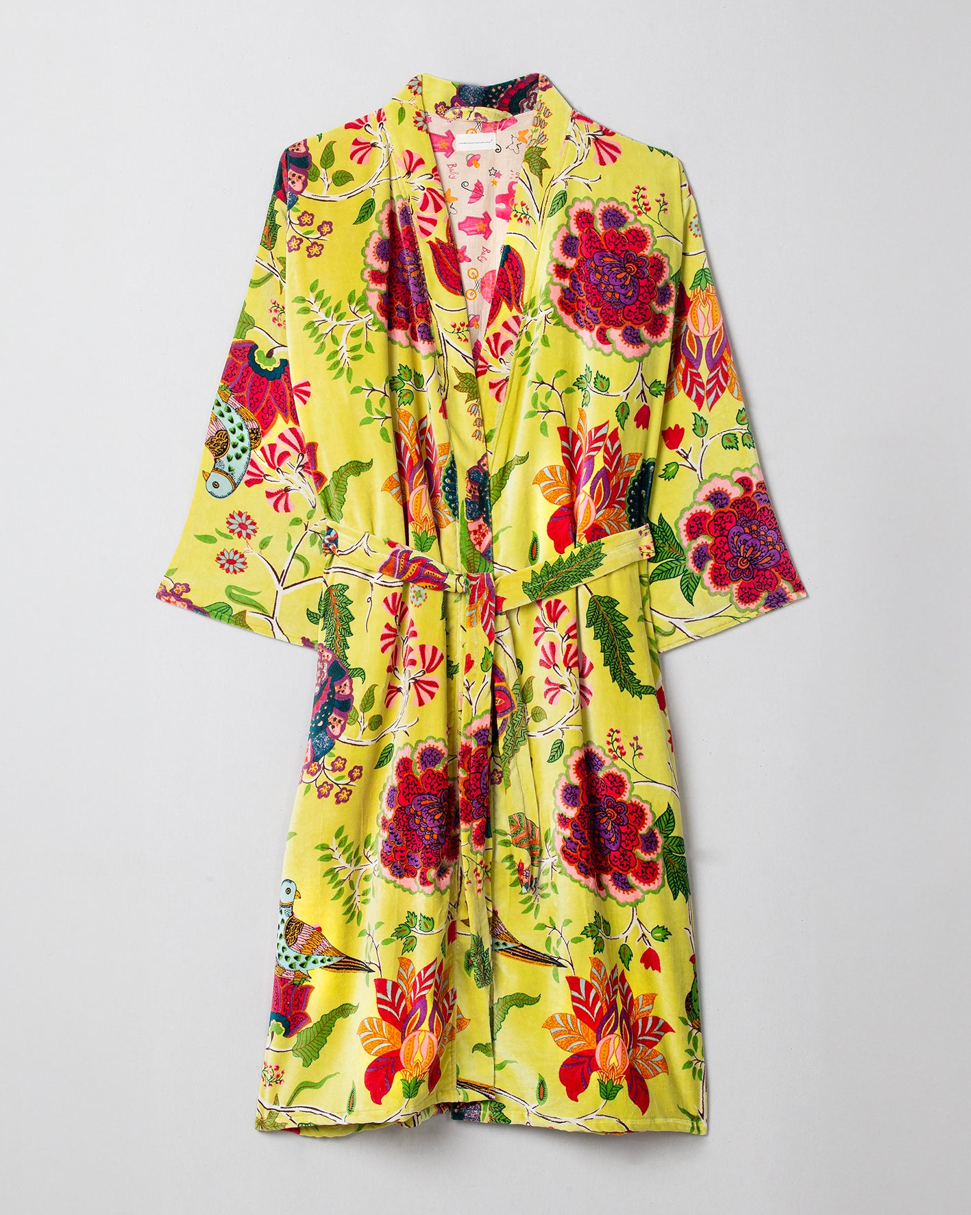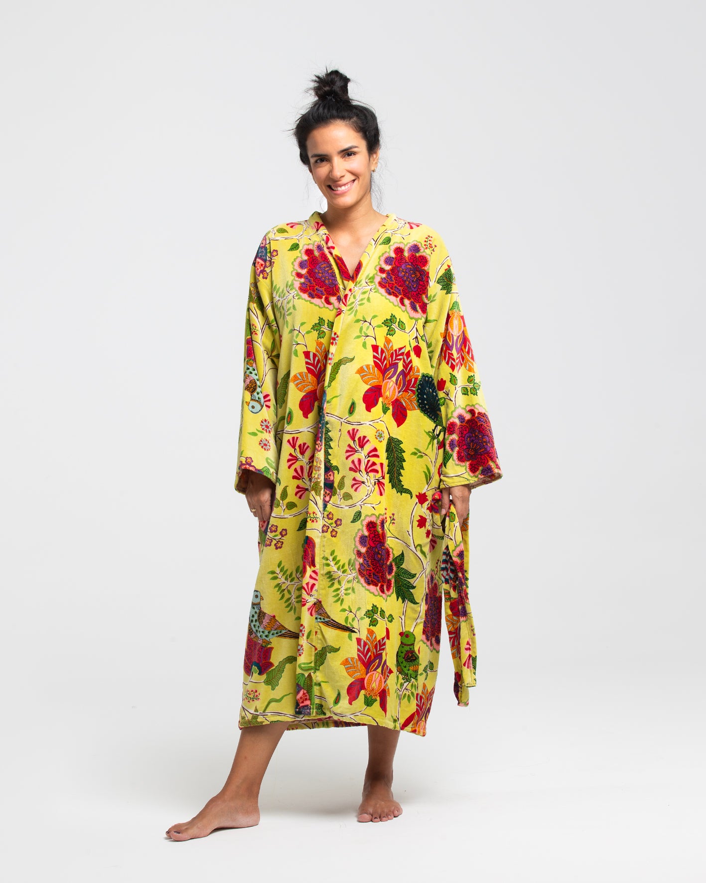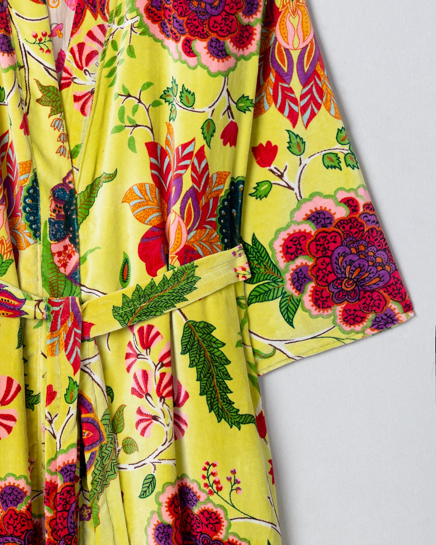 A printed velvet kimono is the epitome of luxury and style. Crafted from sumptuous velvet fabric, it features exquisite, intricate patterns and designs, adding a touch of opulence to any wardrobe. The rich texture and vibrant colors make it a statement piece for lounging in elegance or making a fashionable entrance at special occasions.