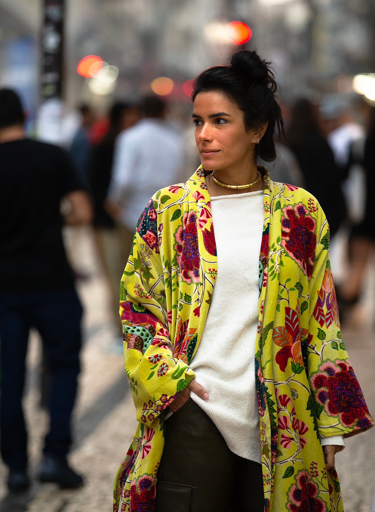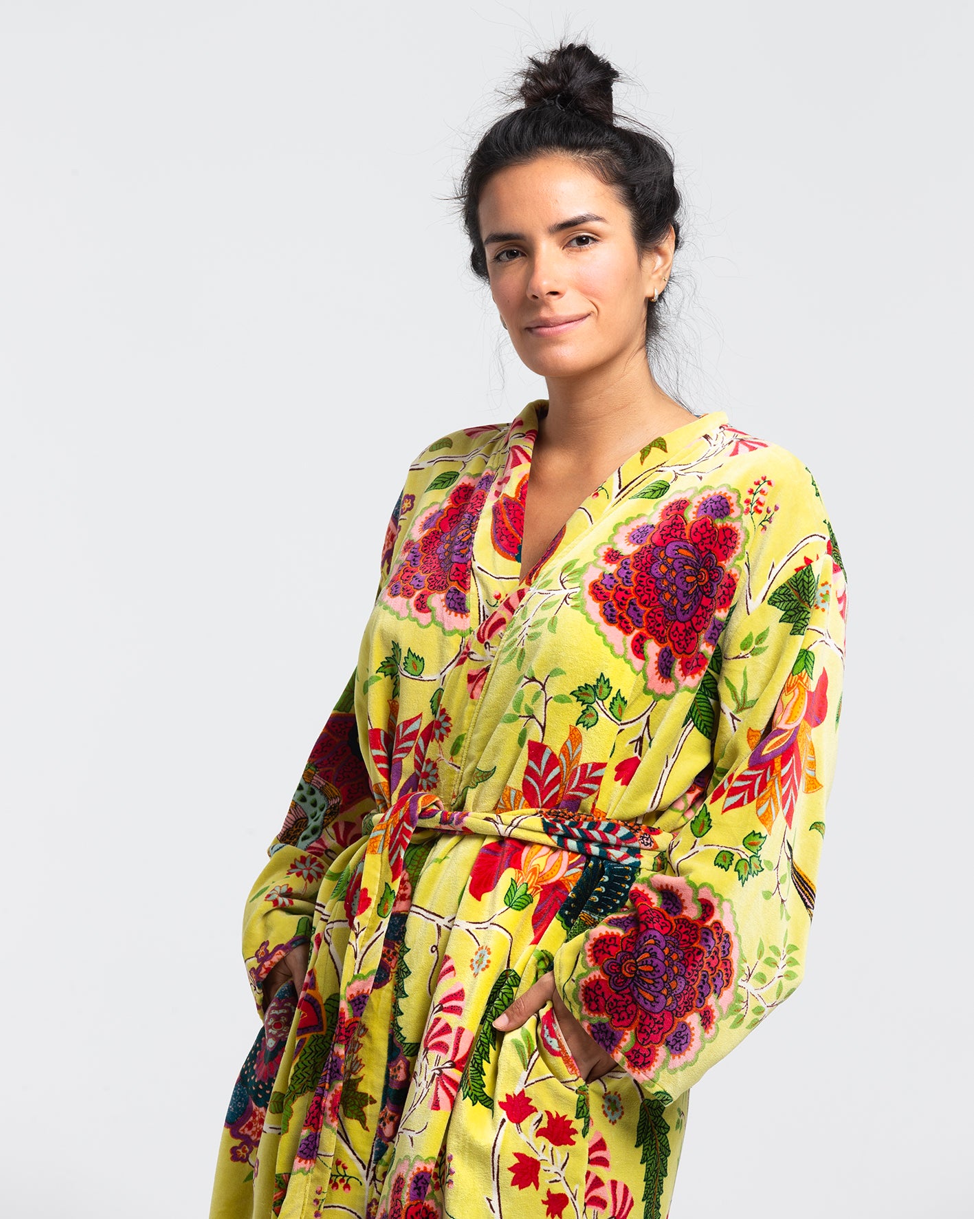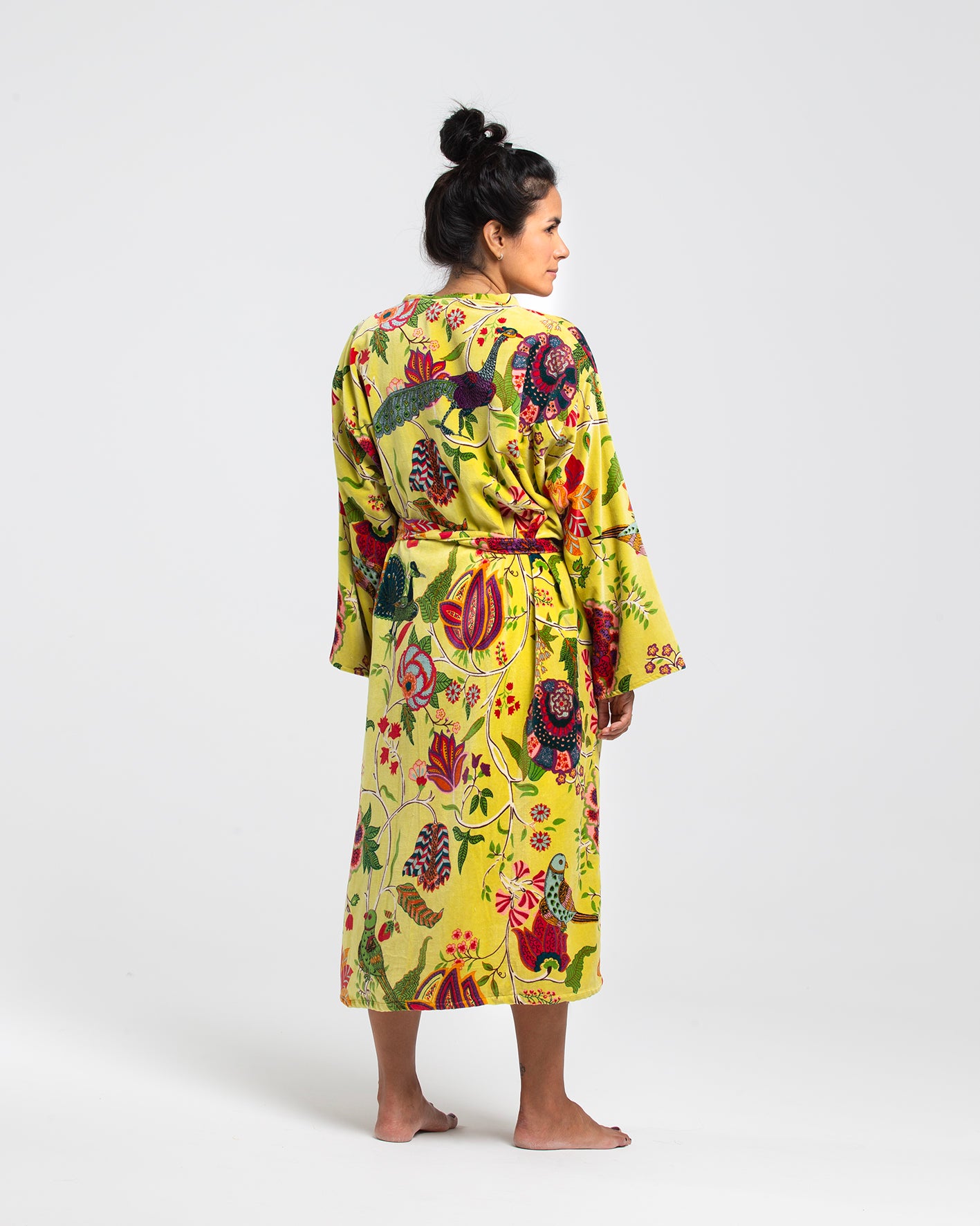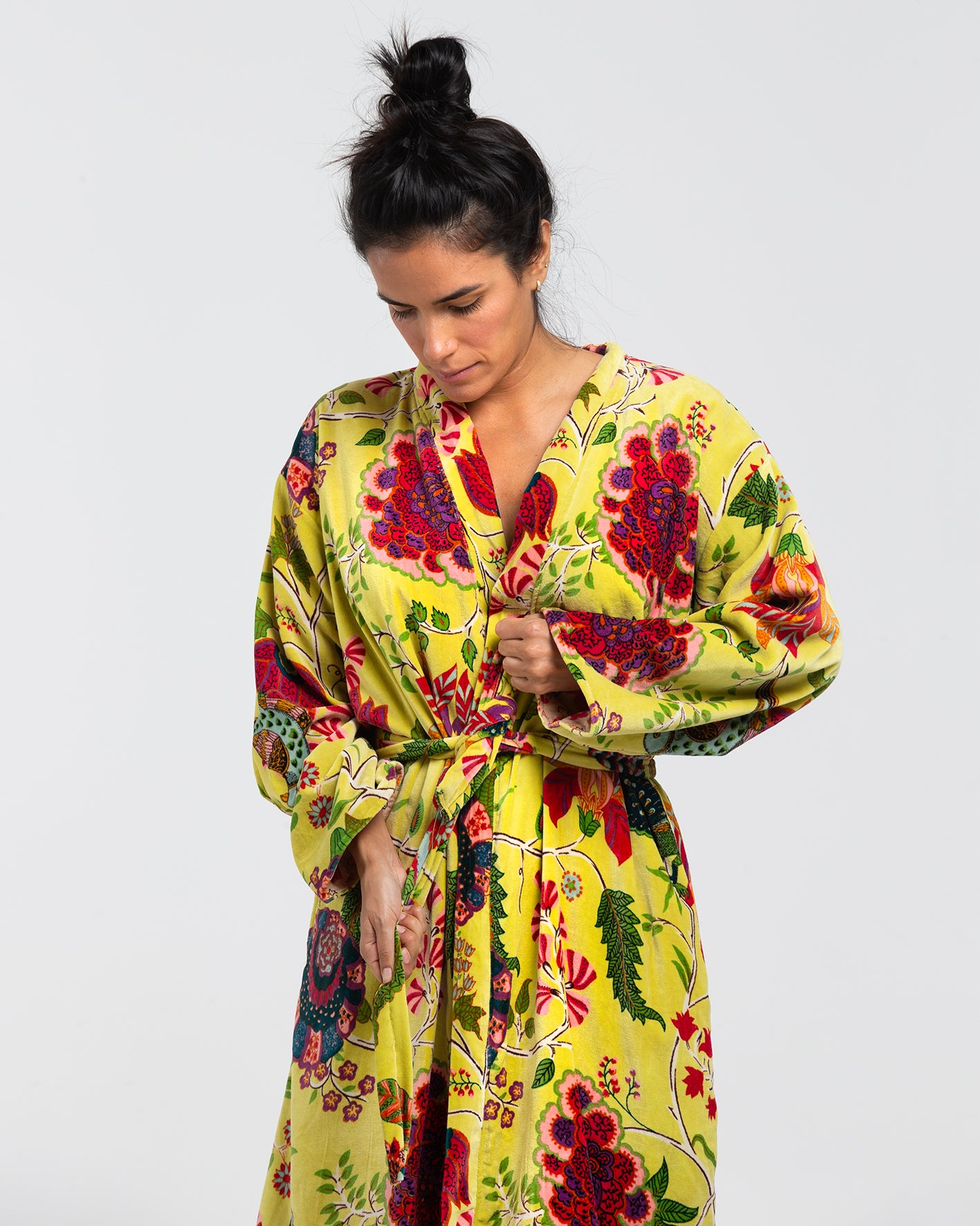 A printed velvet kimono is the epitome of luxury and style. Crafted from sumptuous velvet fabric, it features exquisite, intricate patterns and designs, adding a touch of opulence to any wardrobe. The rich texture and vibrant colors make it a statement piece for lounging in elegance or making a fashionable entrance at special occasions.